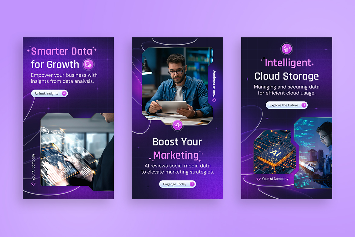 These templates are tailored for businesses at the forefront of AI, smart technology, data analytics, and automation. Ideal for AI developers, cloud tech companies, robotics firms, and anyone in the technology space, these story templates provide a visually stunning and effective way to communicate your brand’s message on Instagram and Facebook.