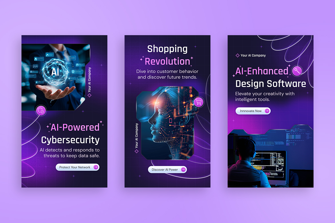 With this collection of AI-themed story templates, you’ll have all the tools you need to create visually compelling and effective stories that reflect your brand’s innovation and technological prowess. Capture your audience’s attention with stunning, AI-driven visuals, increase your social media impact, and position your business as a leader in the fast-evolving world of artificial intelligence.