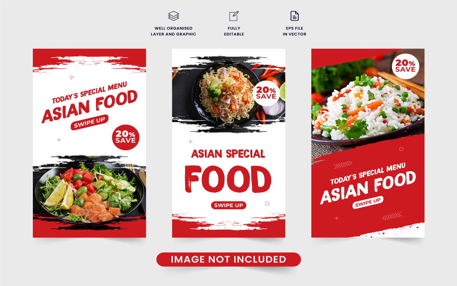 Asian food promotion story template. Asian food social media story template set design with red and white colors. Special story template collection for the restaurant food menu. Asian food promotional web banner design for marketing.