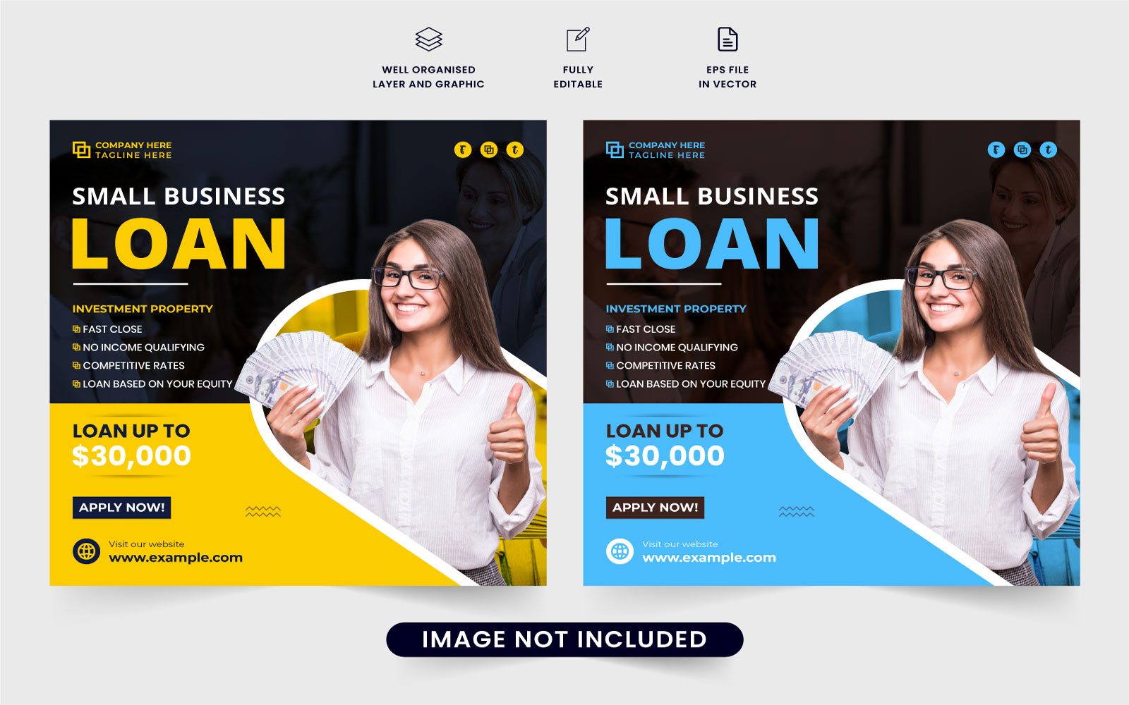Business loan social media post vector. Bank loan service promotional template vector for digital marketing. Small business loan and liability template design with yellow and blue colors. Modern banking business social media post vector.