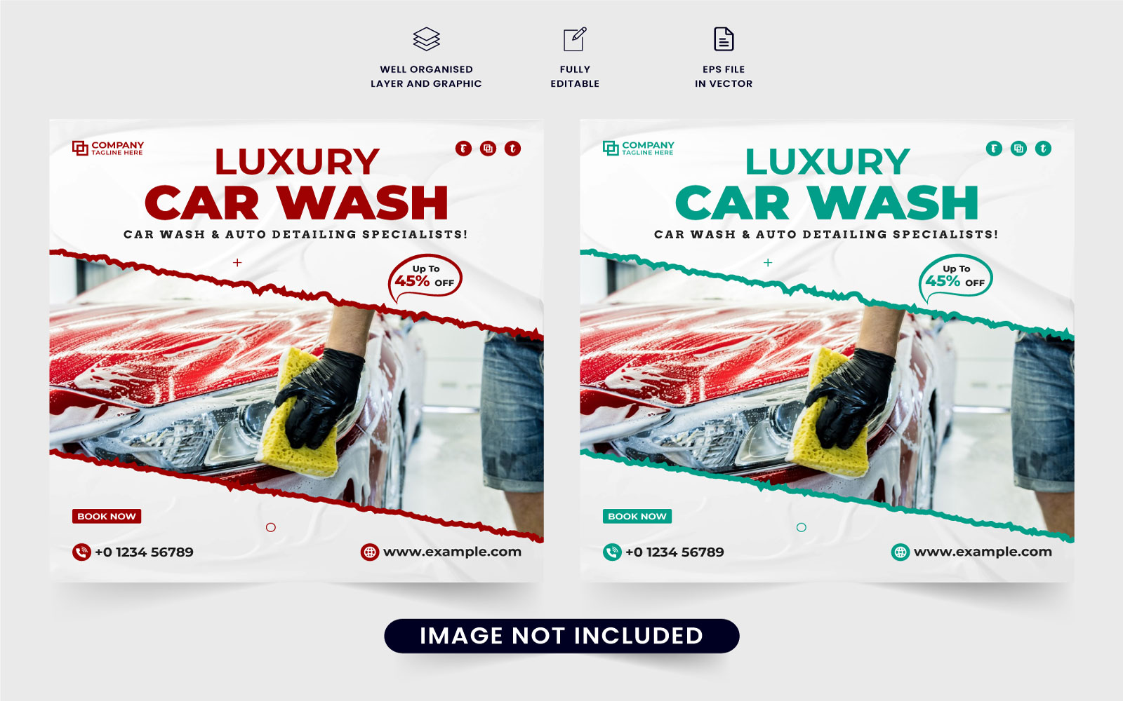 Car cleaning social media post vector. Luxury car wash business template design with red and aqua colors. Vehicle cleaning service social media post vector with abstract brush effect. Automobile cleaning and repair service promotion.