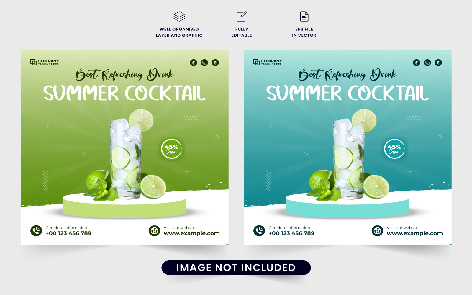 Cocktail sale and promotion template. Best cocktail social media post vector with green and blue colors. Organic cocktail and juice sale template design for digital marketing. Summer beverage advertisement poster vector with brush effect.