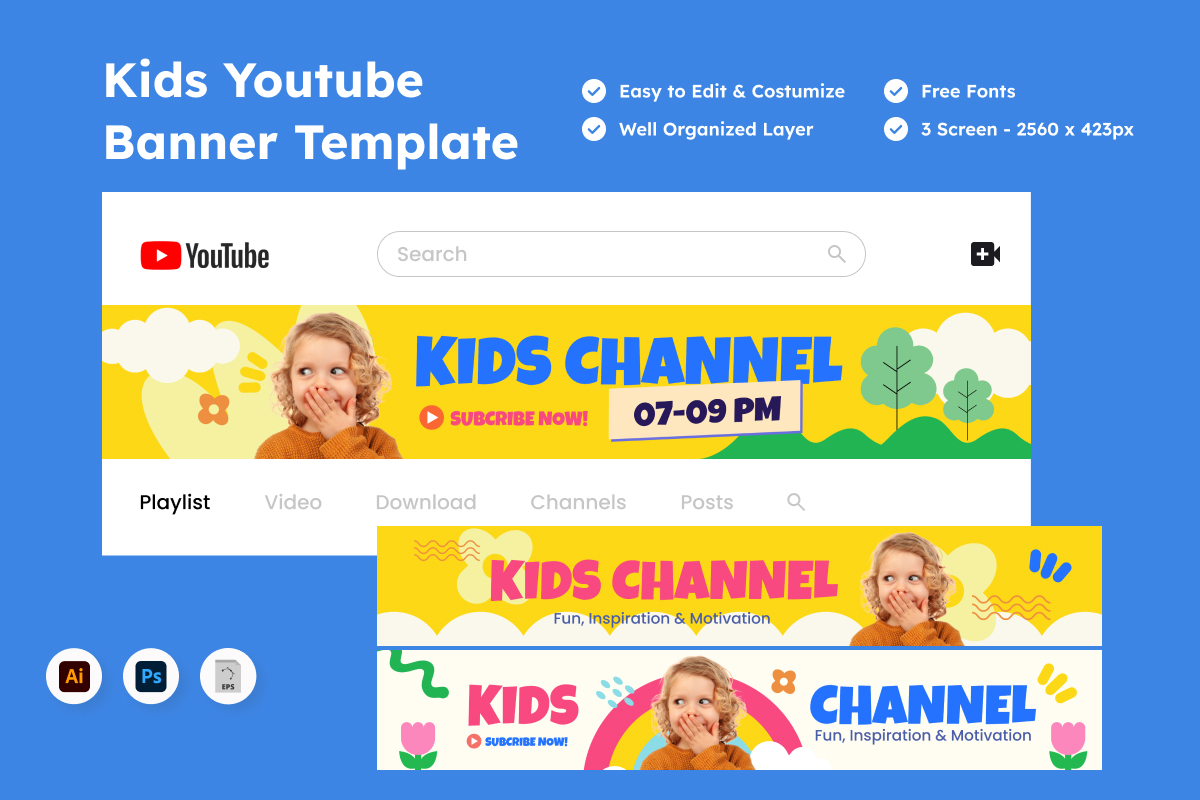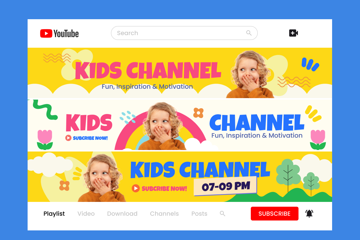 Add a colorful and fun touch to your kid's YouTube channel with this playful banner design. Perfect for engaging young viewers and building a dynamic presence.