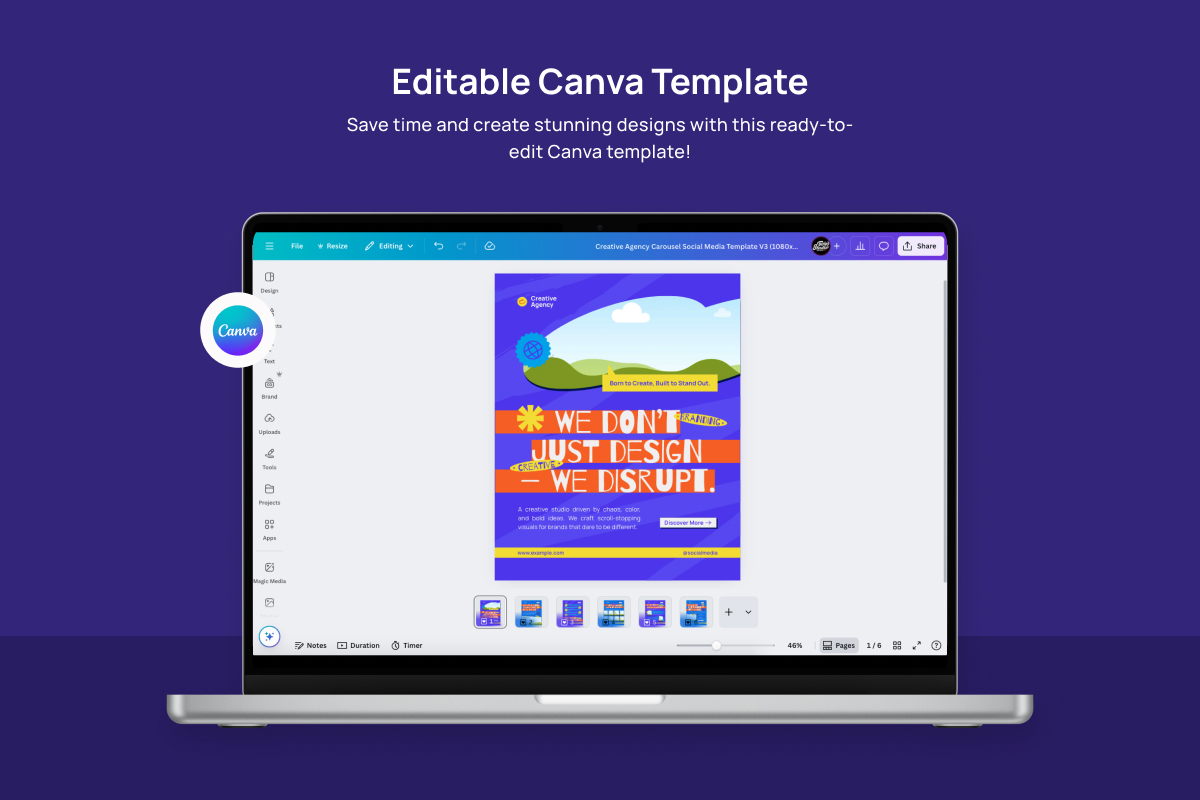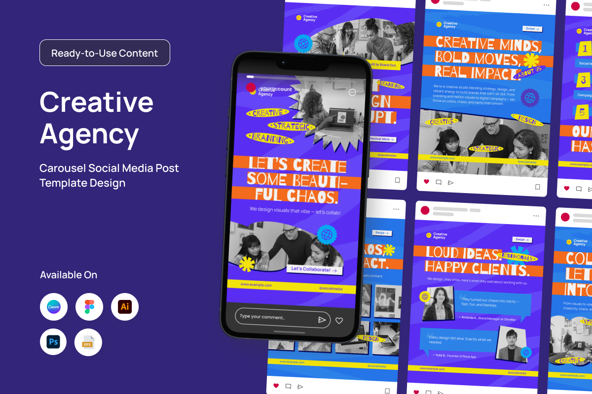 This carousel layout collection helps agencies and design studios communicate their vision through structured yet expressive slides. The combination of bold titles, balanced grids, and bright color accents creates a dynamic storytelling rhythm ideal for showcasing services, case studies, or creative insights.