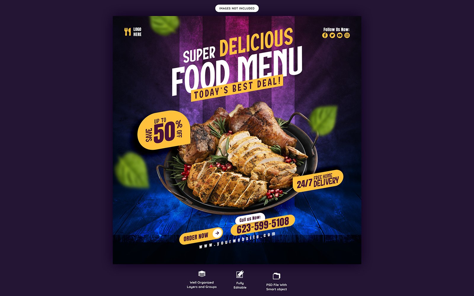 Delicious Burger Food Menu Template design are perfect for your business promotion. Ready to use for Multipurpose uses. This Promotion template best for any personal or corporate use. All main elements are editable and customizable. You can change image with the smart object. Latest design and easily photo change option.