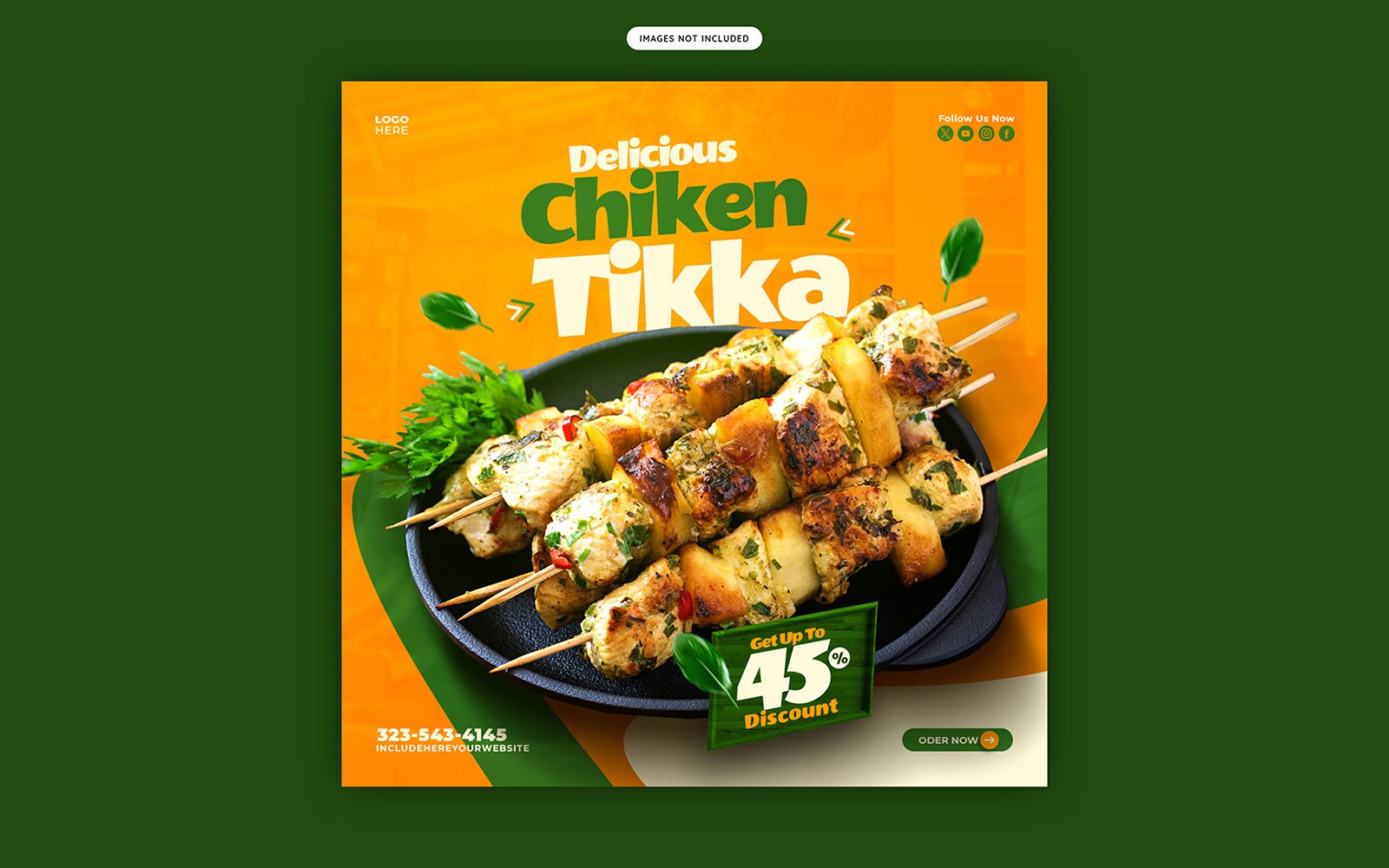 Delicious Food Menu Social Media Post Template design are perfect for your business promotion. Ready to use for Multipurpose uses. This Promotion template best for any personal or corporate use. All main elements are editable and customizable. You can change image with the smart object. Latest design and easily photo change option.