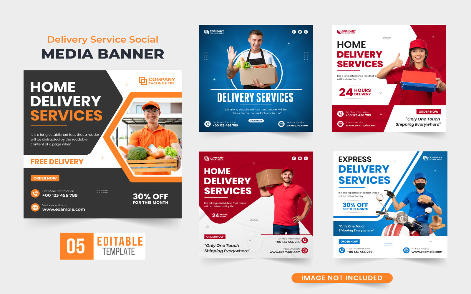 Delivery service web banner collection. Express home delivery service social media post bundle with blue and red colors. Home delivery service web banner collection for business promotion. Set of supermarket free delivery offer template.
