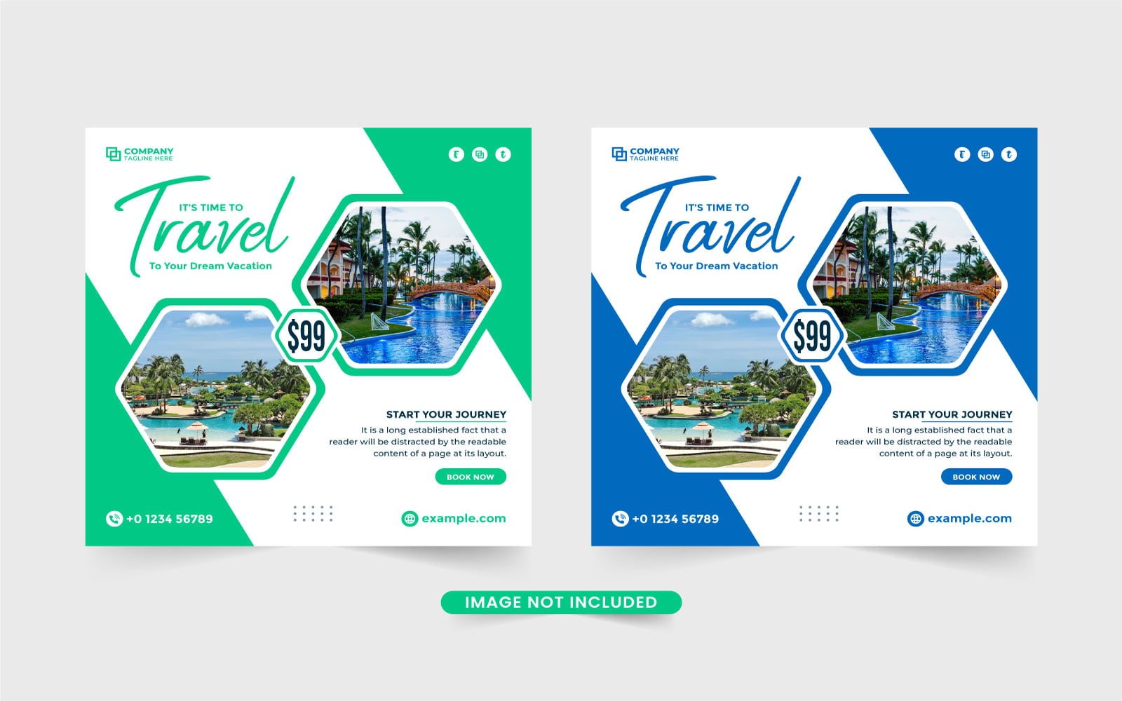 Dream vacation planner template vector. Dream vacation and tour planner agency social media post. Travel agency banner template with abstract shapes. Touring business poster design with green and blue colors. Family vacation planner design.