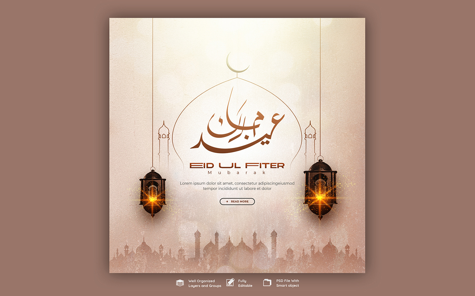 Eid Mubarak And Eid ul fitr Social Media Post Template design are perfect for your business promotion. Ready to use for Multipurpose uses. This Promotion template best for any personal or corporate use. All main elements are editable and customizable. You can change image with the smart object. Latest design and easily photo change option.