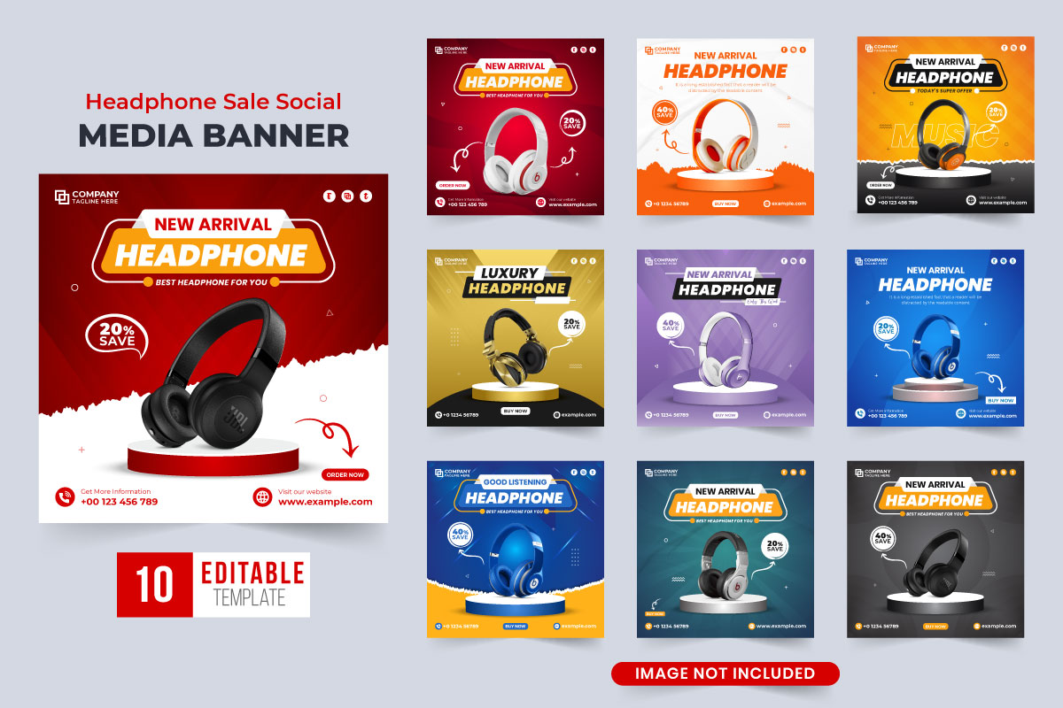 Electronic store promotion template set. Headphone sale template bundle design for social media marketing with red and blue colors. Special headphone web banner design collection with abstract shapes. Modern headphone business template set.