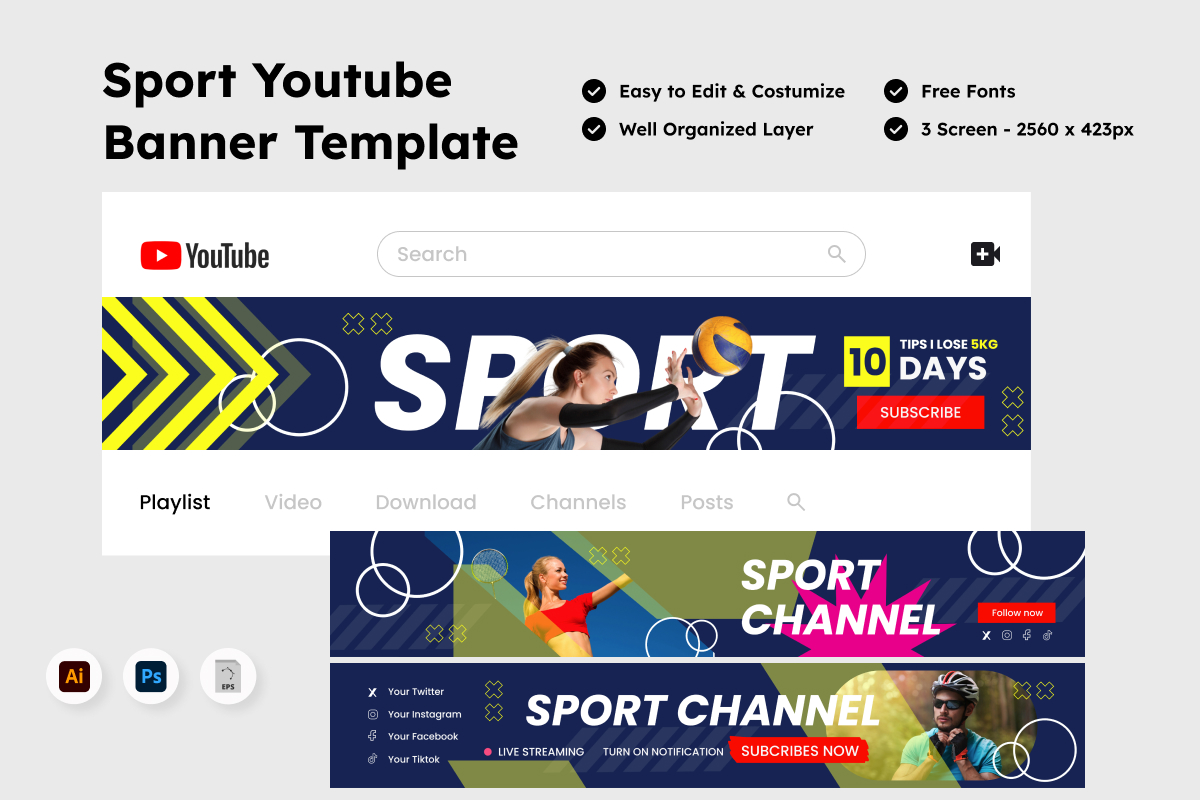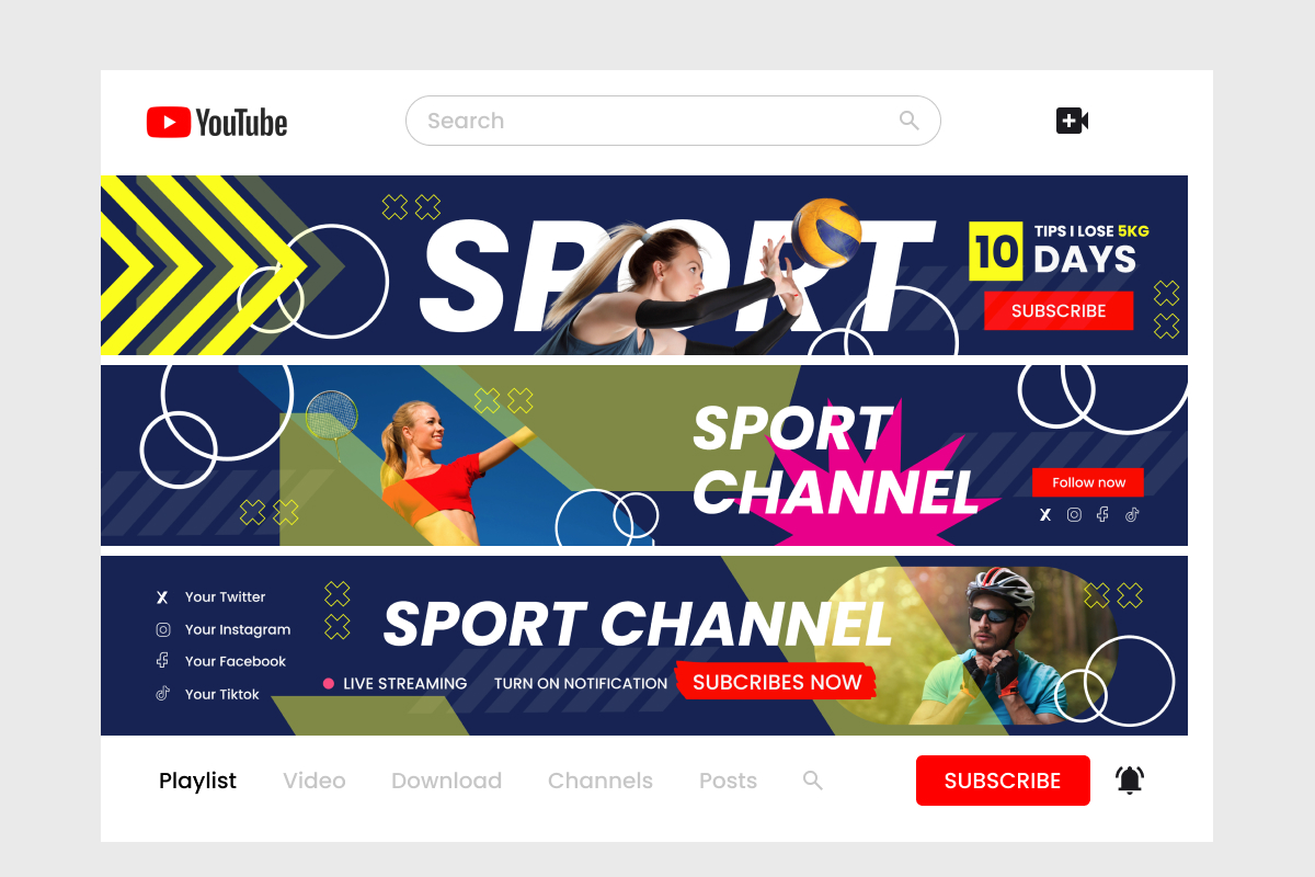Bring excitement to your sports channel with this high-energy banner design. Featuring dynamic visuals and a modern layout, perfect for athletes or sports enthusiasts.