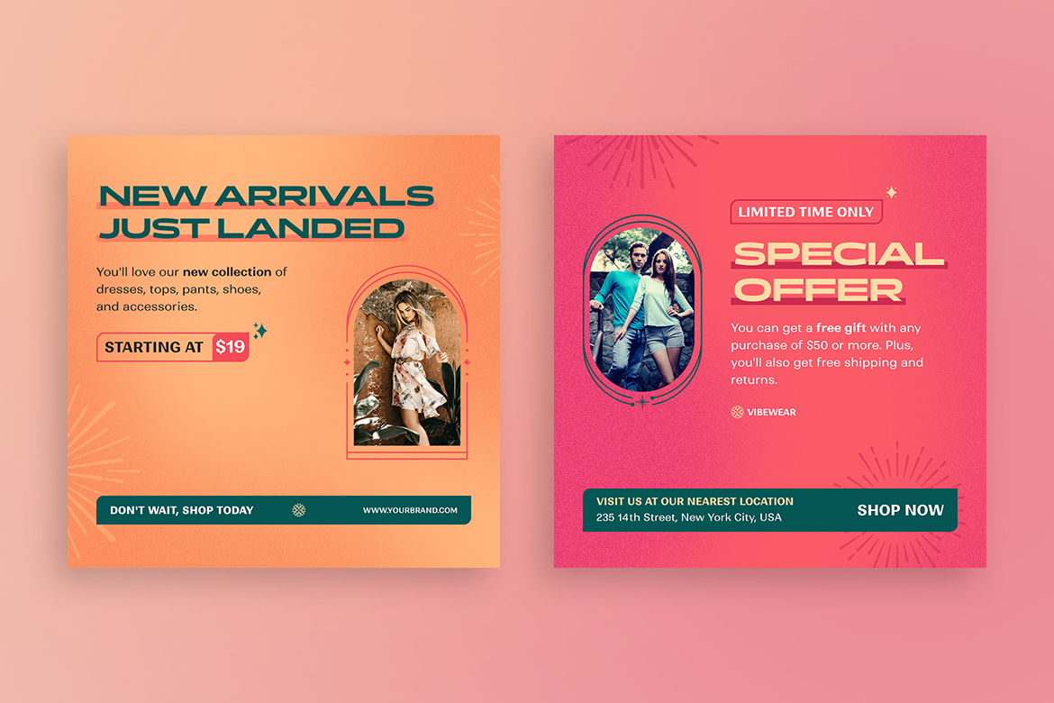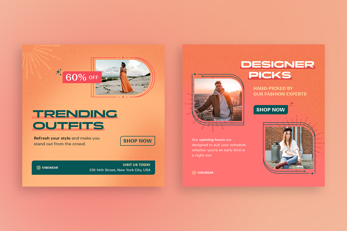 This pack contains 6 different designs that are perfect for showcasing your fashion sale, clothing, apparel, new arrivals and designer picks. You can easily customize them with your own images, text, colors and fonts.