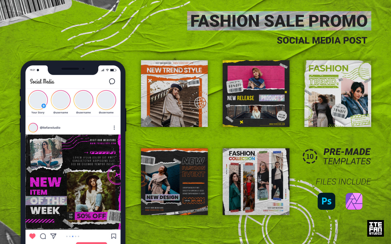 Fashion Sale Promo Social Media Post included 10 pre-made templates design for social media post. It's suitable for promoting new trending fashion and fashion big sale discount events on most of the social media platforms, such as Instagram, Facebook, Twitter, Pinterest and more.