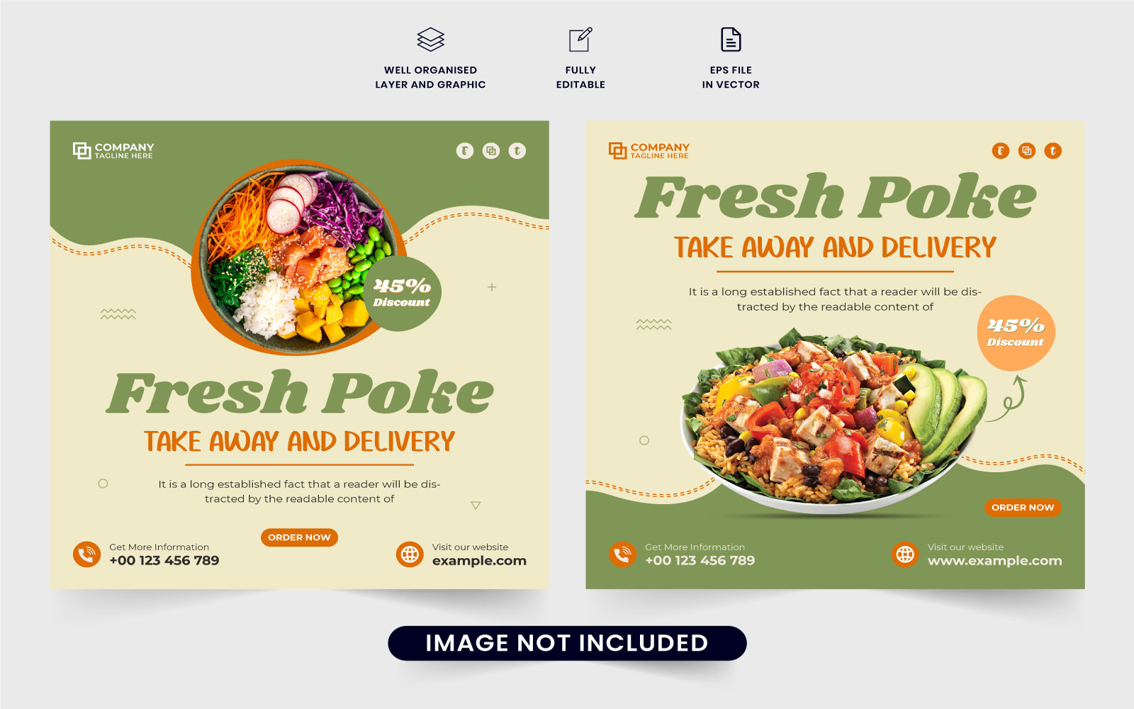 Food promotion poster for marketing. Healthy food menu template design with abstract shapes. Special food discount web banner vector with green and orange colors. Restaurant promotion poster template vector with photo placeholders.