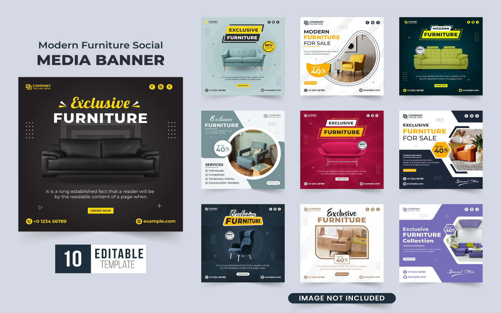 Furniture sale template bundle vector. Creative furniture advertisement social media post set vector. Furniture store promotion and sale template bundle with dark and yellow colors. Exclusive furniture web banner collection vector.
