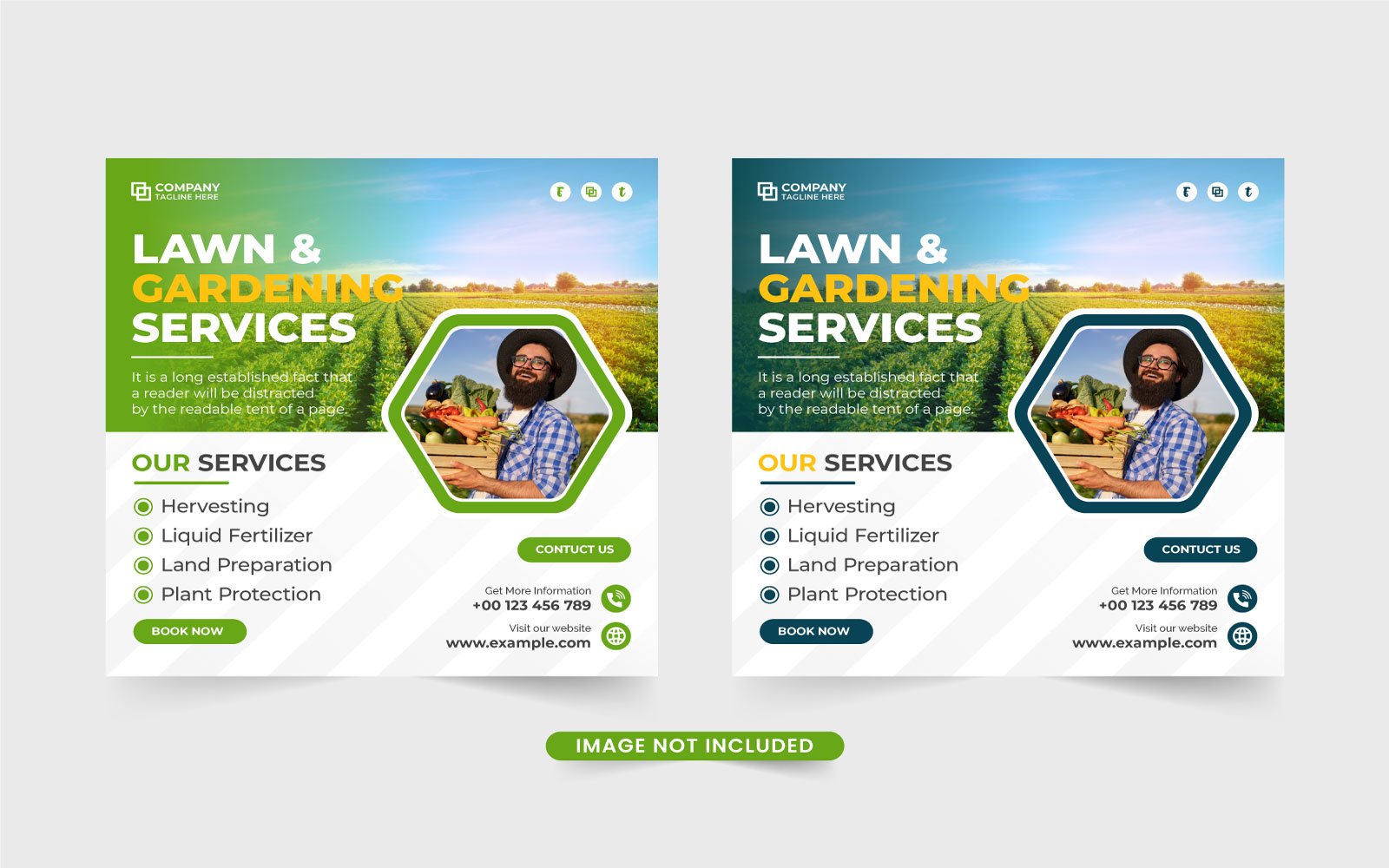 Gardening service web banner vector. Lawn and gardening social media post vector for marketing. Landscaping and farm management service web banner with green and blue colors. Agro farming service social media template design.