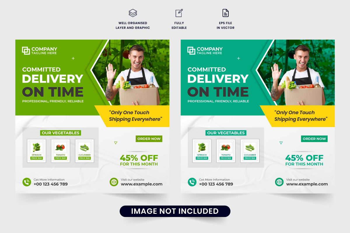 Grocery delivery service template vector. Shipping and delivery service promotional web banner design with yellow and green colors. Modern food delivery business advertisement poster vector. Supermarket delivery and courier business.