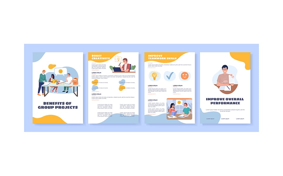 Group projects flat vector brochure template. Booklet, leaflet printable flat color designs. Editable magazine page, reports kit with text space. Sigmar One, Balsamiq Sans, Comfortaa fonts used