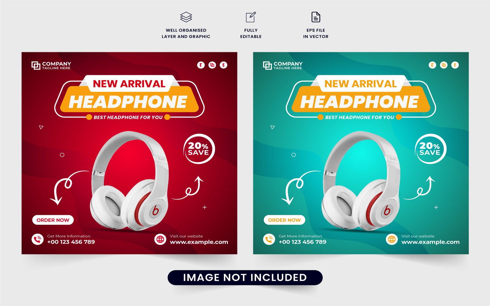 Headphone sale discount template vector. New arrival headphone brand promotion template with discount offer section. Modern headphone social media post vector with red and aqua colors. Special headphone sale web banner design for marketing.