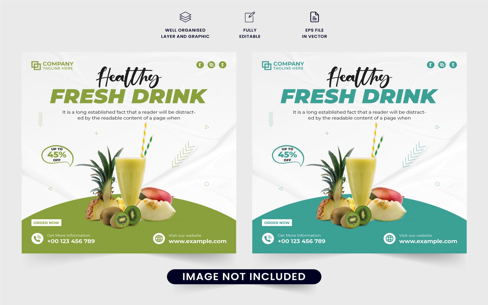 Healthy drink promotional template. Fresh and healthy drink promotional template vector for restaurants and juice bars. Organic juice and cocktail advertisement poster design with green and blue colors. Healthy drink social media post.