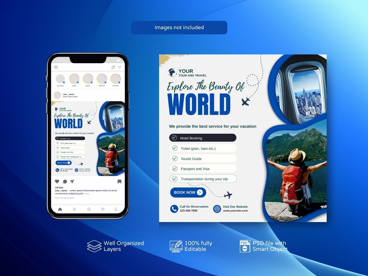 This is a clean eye-catchy Holiday Travel package Social Media post design template suitable for Travel agency businesses.