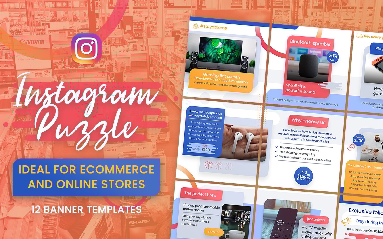 This Instagram puzzle template is ideal to be used by small and medium businesses, electronic shops, technology stores, ecommerce businesses, agencies, companies, offices, marketers or corporations.