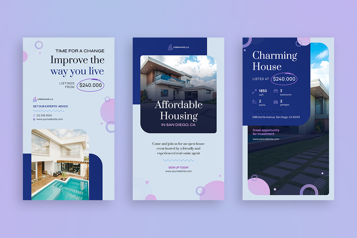 With these templates, you can create real estate stories without hassle. Whether you are selling or renting, these banners will help you reach your target audience and grow your business.
