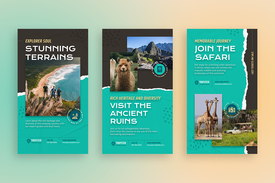 With our templates, you can easily create stunning stories that capture the attention of your followers and potential customers. You can choose from a variety of themes and styles, such as explorer, traveler, tour, guide, holiday, and more. You can also customize the templates with your own photos, text, and logo.