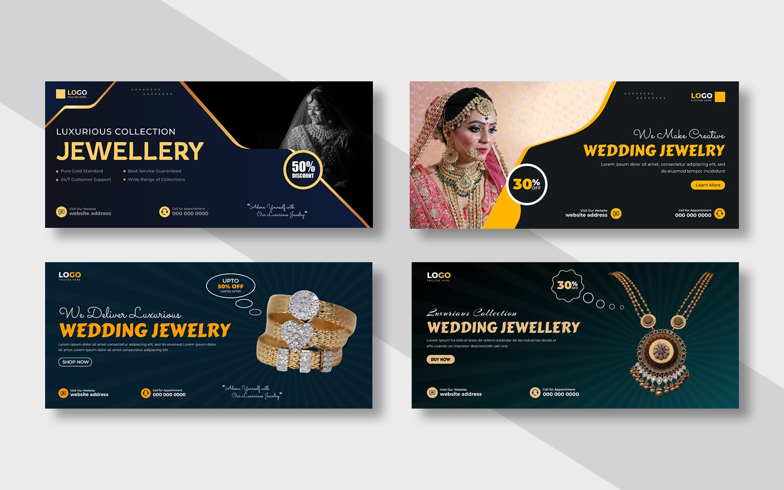 This Wedding Jewelry Sale Facebook Cover Banner Template pack is designed to help bridal shops and jewelry brands promote their offers with a soft, polished look. The set includes four different layouts, all created in Adobe Illustrator with organized layers that make editing simple. You can update text, switch images and adjust colors to match your brand or highlight new collections. Each design focuses on showcasing discounts and featured pieces in a way that feels elegant and easy to read. Whether you’re preparing for a seasonal sale or a bridal campaign, these templates give you ready-made covers that look professional and fit a wide range of styles.