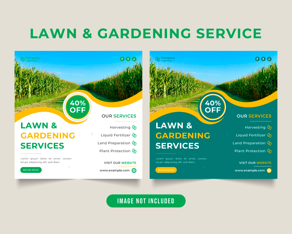 Lawn mower and garden cleaning service marketing poster vector. Farm management and gardening service social media posts with photo placeholders. Agro farm and landscape management business promotion.