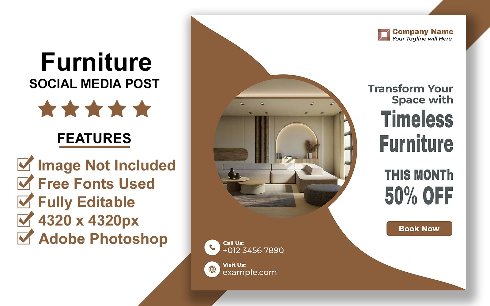 Promote luxury and high-end furniture with this sophisticated PSD post template for social media. Designed at 4320x4320px with 300 DPI, this Adobe Photoshop file includes smart object layers for effortless image updates. Ideal for luxury interior designers, boutique stores, and home décor campaigns, this template is fully editable and perfectly aligned with branding needs.