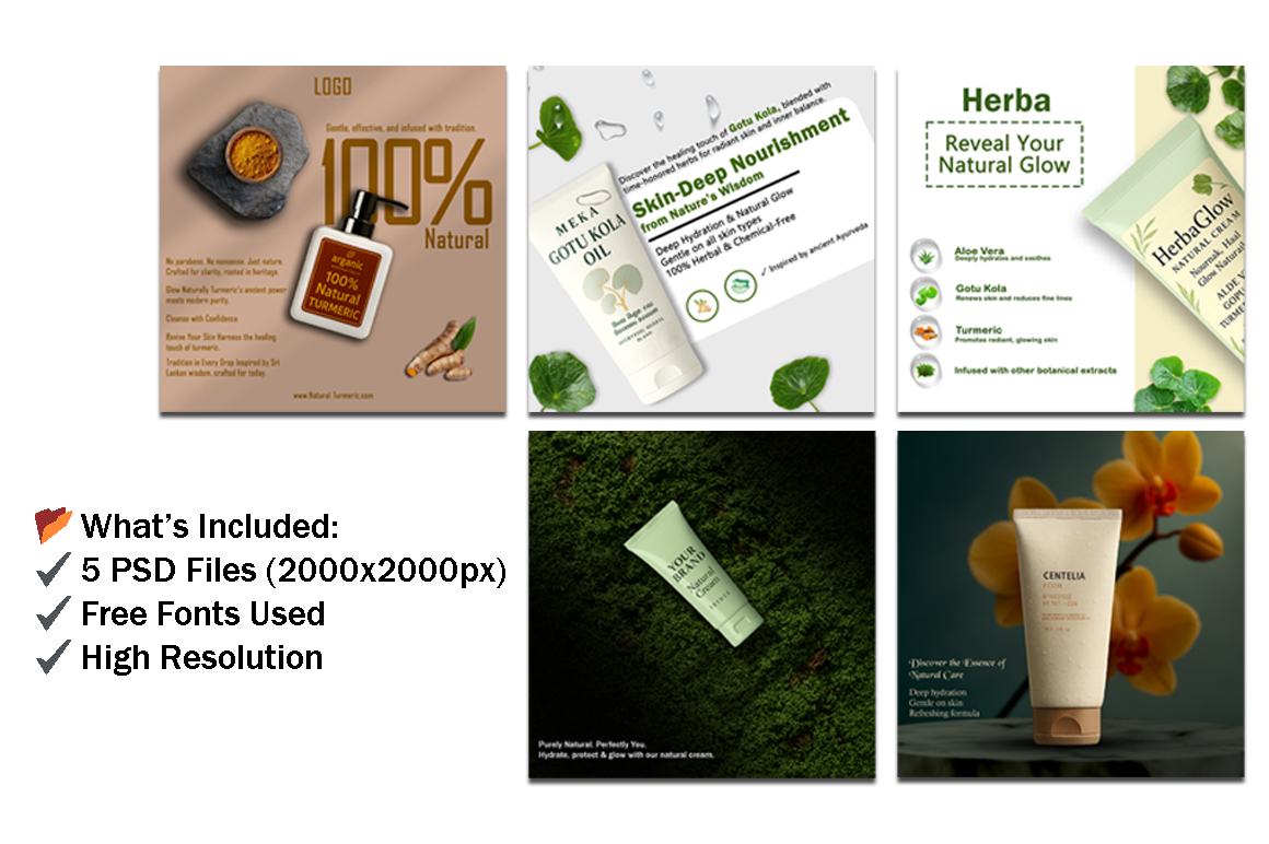 This bundle includes 5 professional Photoshop PSD templates designed for promoting natural skincare, herbal, cosmetic, and organic products on Instagram and Facebook. Each template is fully editable, well-organized, and created in a modern and natural style. The layouts are optimized for 2000x2000 px, perfect for social media marketing.