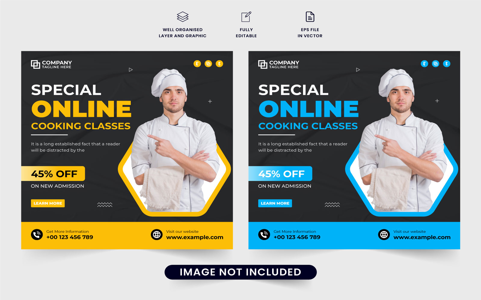 Online cooking class promotion poster. Professional cooking class template design for social media promotion. Online culinary class promotional web banner template with yellow and blue colors. Special chef training poster vector.