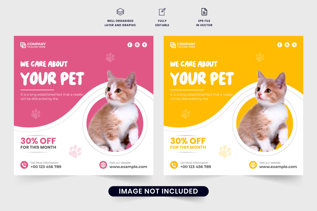 Pet care center social media post vector. Pet shelter social media post vector with yellow and pink colors. Animal adoption and grooming center advertisement web banner vector. Petcare promotional poster design with geometric shapes.