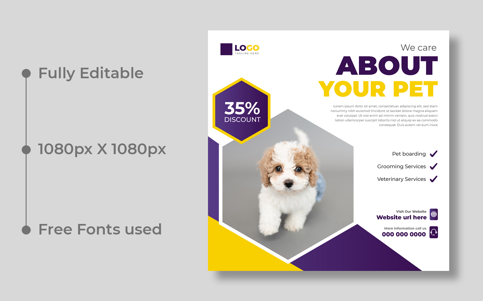 Promote your pet care services with this beautifully designed Pet Care Social Media Instagram Post Template, crafted in Adobe Illustrator for easy customization. Featuring a clean, modern, and engaging layout, this template is perfect for pet shops, veterinary clinics, grooming services, or adoption centers looking to boost their social media presence. The design highlights eye-catching visuals, professional typography, and well-structured sections that make your message stand out. You can easily edit text, images, and colors to match your brand identity and connect with pet owners effectively. Whether you’re advertising special offers, sharing pet care tips, or promoting services, this template provides the ideal balance of creativity and professionalism to attract and engage your audience on Instagram.