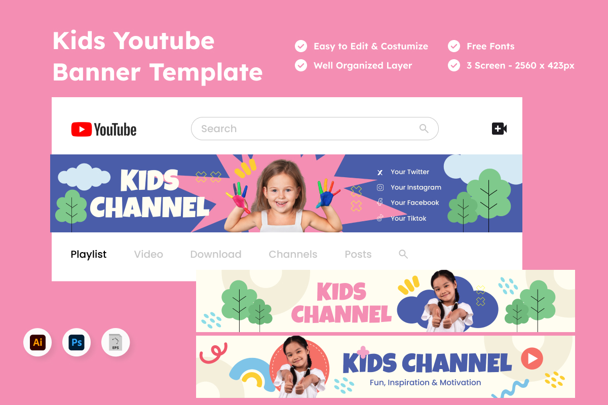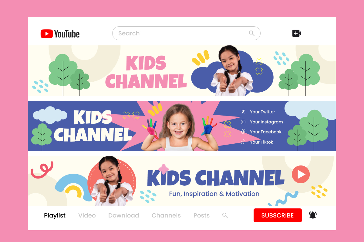 Brighten up your kid's YouTube channel with this fun and vibrant banner design. Perfect for channels focused on children's content, with engaging and playful visuals.
