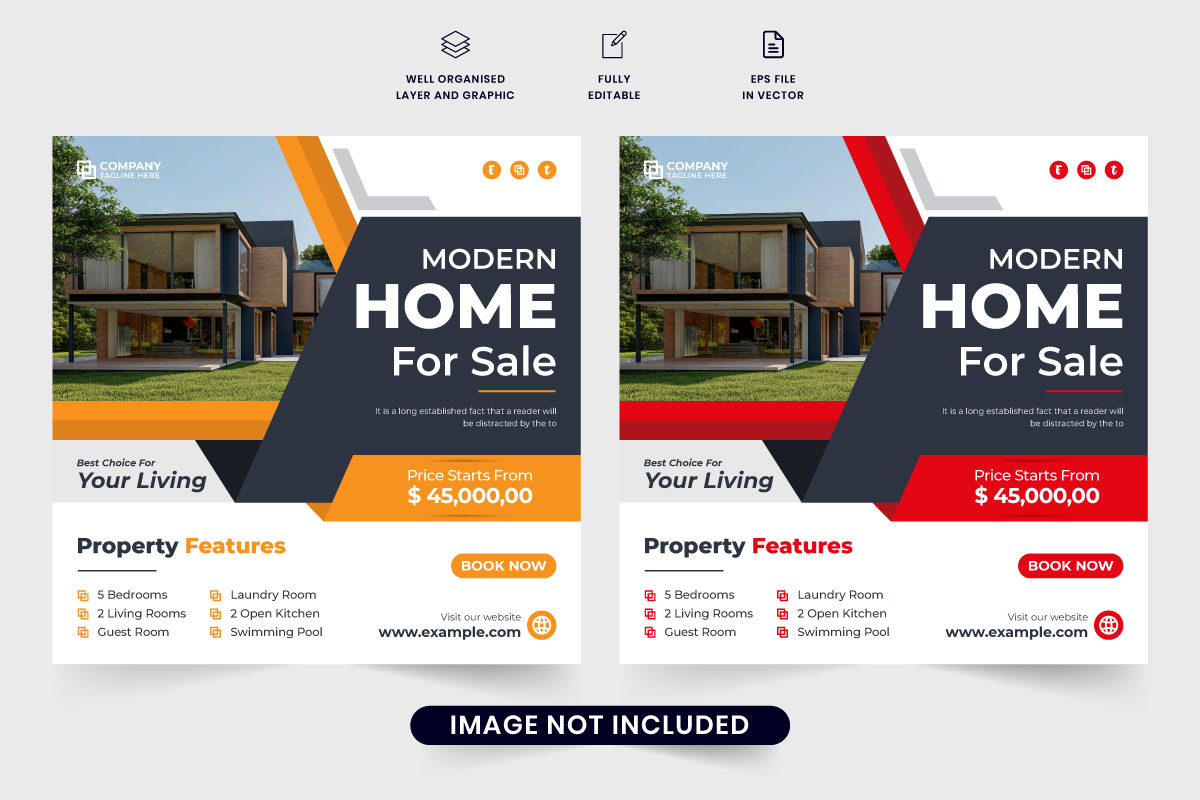 Real estate business promotion poster. Modern home selling business promotional template design with geometric shapes. Real estate company advertisement poster vector with orange and red colors. Home sale social media post vector.