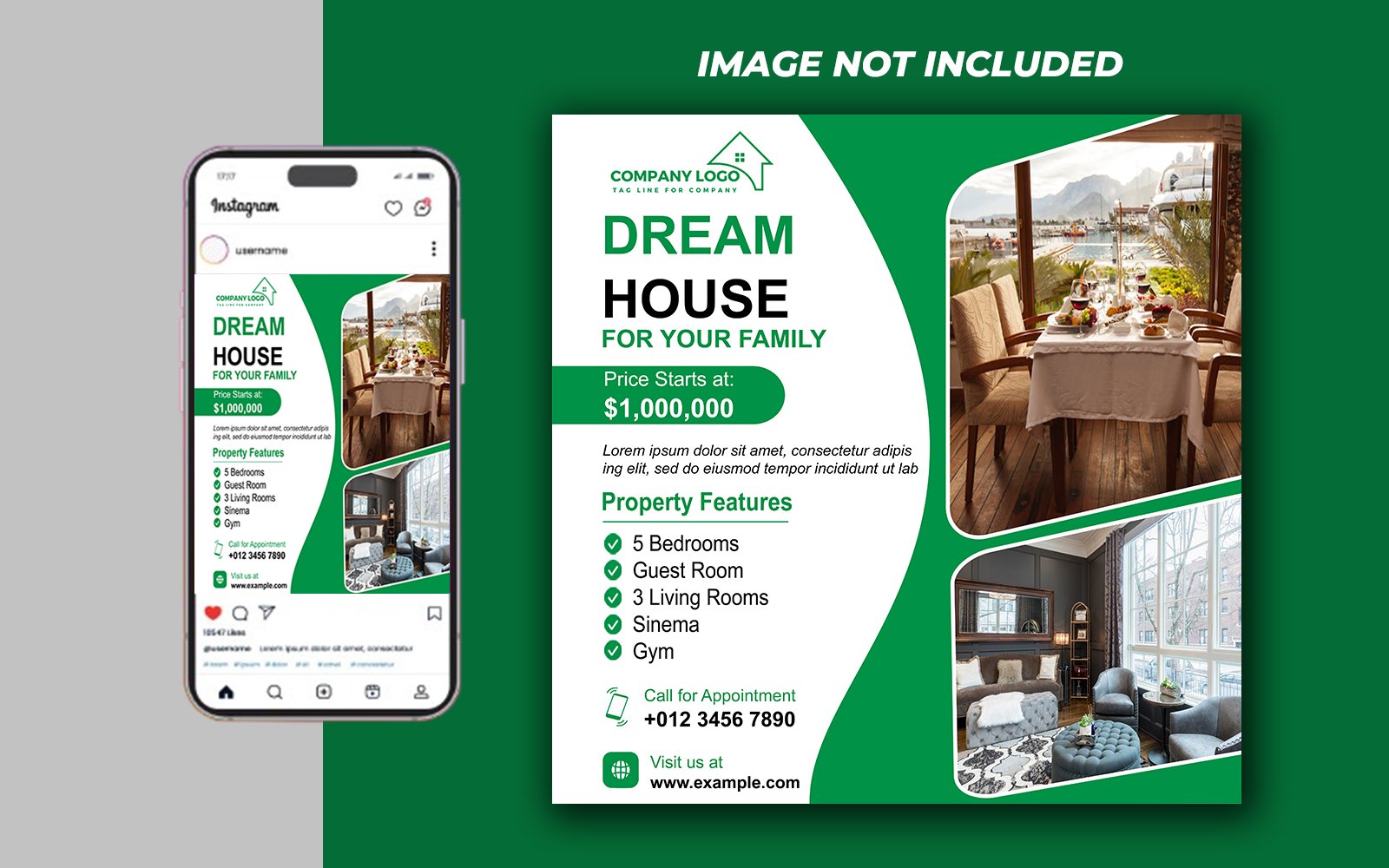 Promote property sales with this Real Estate Sale Promotion PSD Template, designed specifically for realtors and agencies. The square layout is optimized for Instagram and Facebook. Built in Adobe Photoshop, this template is fully editable, featuring smart object functionality for easy photo updates and free fonts for seamless customization. A powerful visual tool to boost engagement and drive sales.
