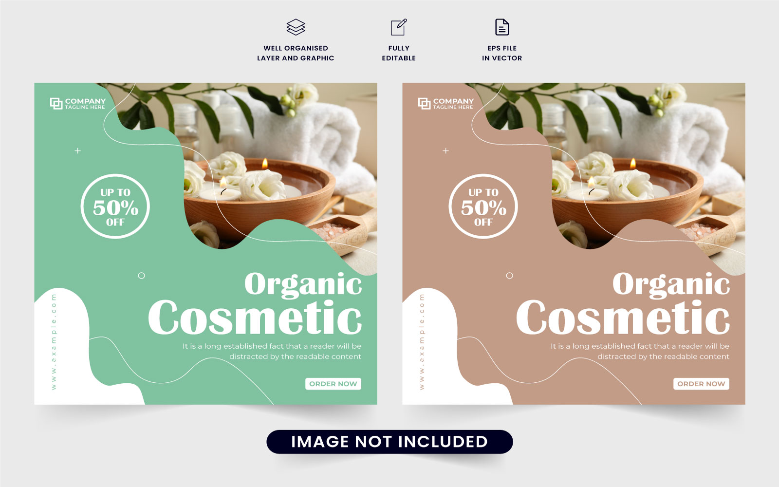 Skincare product sale template vector. Organic cosmetic sale social media post vector with abstract shapes and photo placeholders. Skincare and beauty products advertisement web banner design. Cosmetic business promotional template vector.