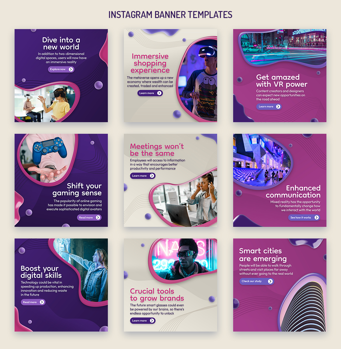 - 27 banner templates - 9 designs in 3 sizes for each template: Instagram post, Instagram story and Facebook banner.