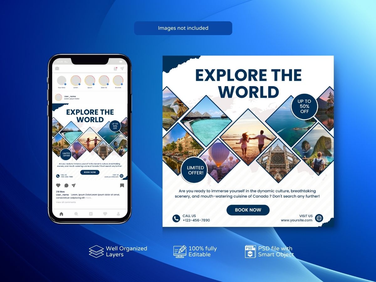 This is a clean eye-catchy Holiday Travel package Social Media post design template suitable for Travel agency businesses.