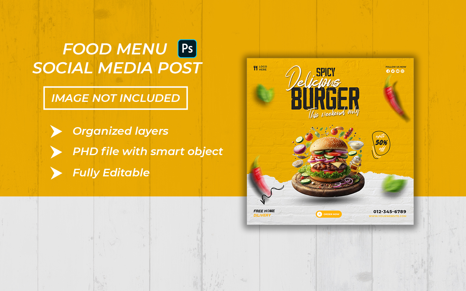Clean and modern Food Social Media Post Template designed to promote your business. This Food Social Media Post template is perfect for any use. All main elements are editable and customizable. You can change the image with the smart object.