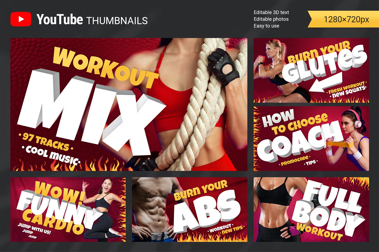 Get cool design for your YouTube channel with this thumbnails set of 6 Photoshop templates. Bright red background and 3d lettering. Put your photos and edit texts. It's so easy! Great for motivation videos, sport videos, fitness tutorials, girl fitness, woman fitness, everyday training, fitness vlog, fitness bloggers.