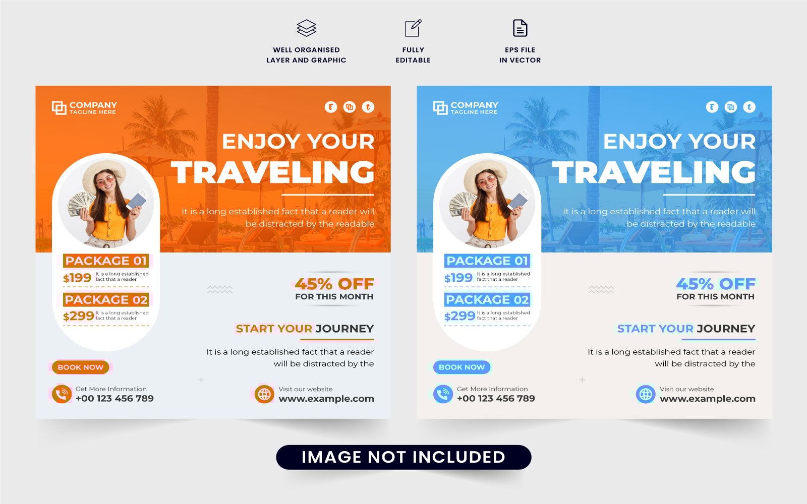 Travel and touring business promotion. Holiday trip advertisement poster design with discount offer. Vacation planner template vector with orange and blue colors. Travel business promotion web banner design for social media marketing.