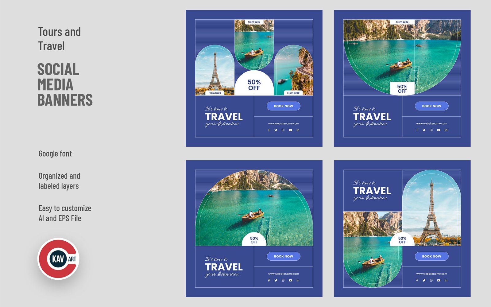 Tours and travel social media post banner template set is perfect to promote / advertise your travel services and tour packages on social media and website.