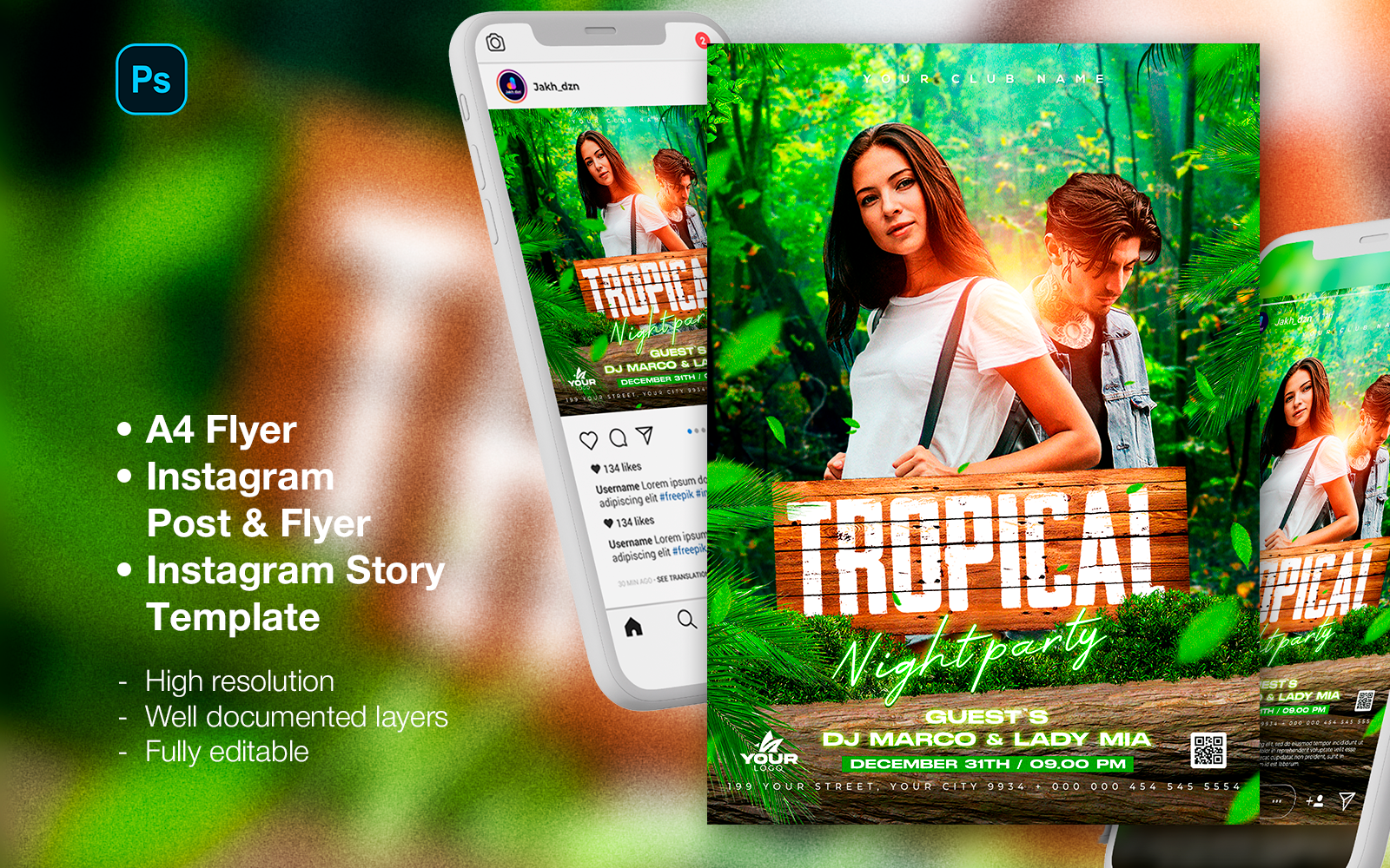 Tropic - Dj Club Night Party Flyer And Social Media Post - Fully customizable DJ flyer and social media post template for Photoshop. This template is very easy to use. You can edit text, colors, and insert model photo easily via Smart Object layer. Graphic effects will be applied automatically.
