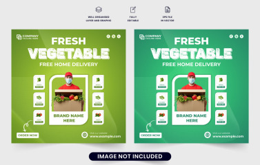 Vegetable delivery service template. Fresh vegetable delivery service poster design for supermarkets. Grocery home delivery service social media post vector with green backgrounds. Special courier business web banner template.