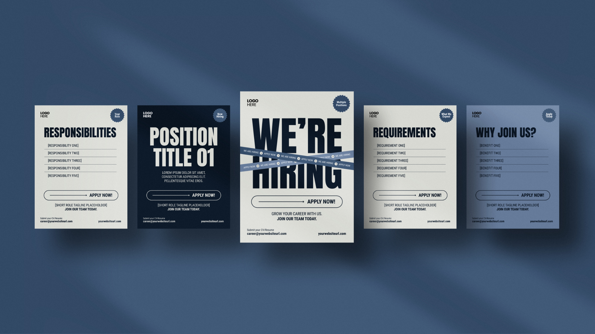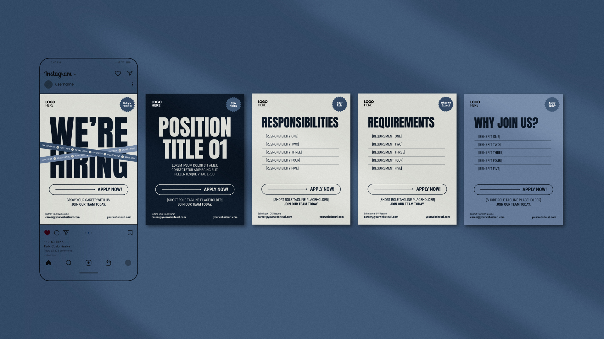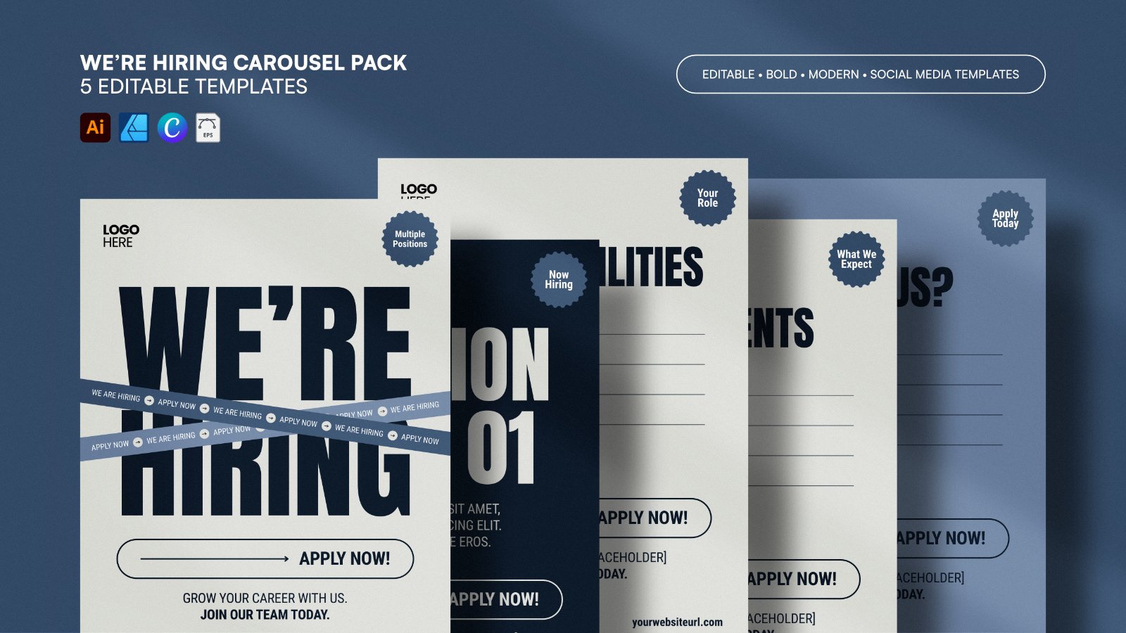 Boost your recruitment campaigns with this We Are Hiring Carousel Pack – a modern, editable, and professional template set designed to announce job vacancies and attract top talent.