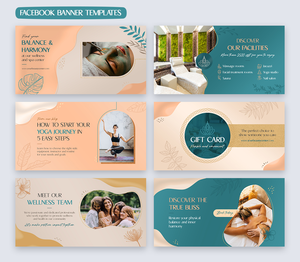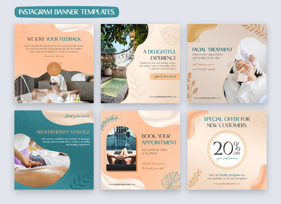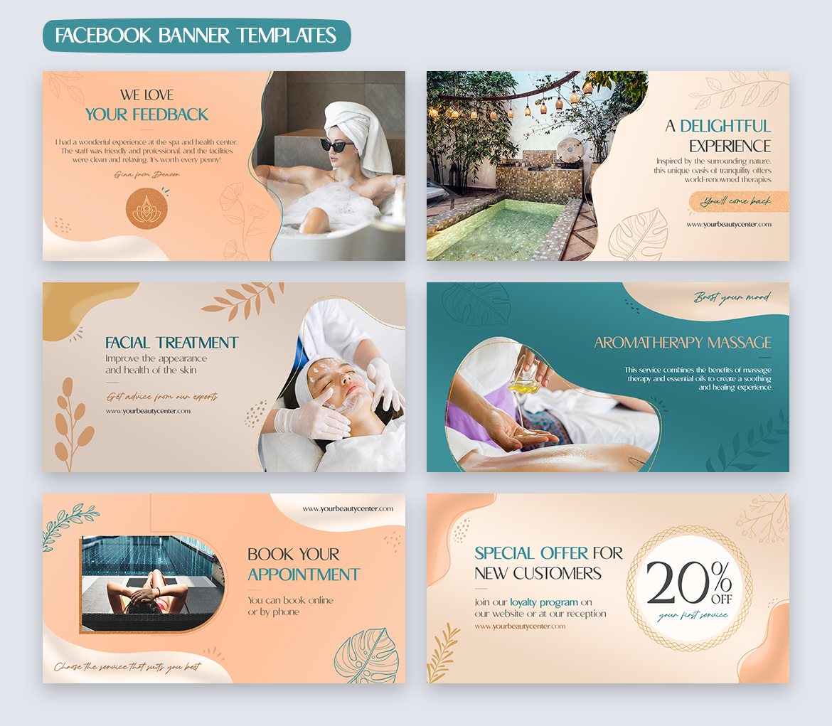 Use social media marketing to build awareness and engagement with your audience. You can post useful tips, inspiring quotes, behind-the-scenes photos, or customer stories that showcase your spa brand. The banners include a call-to-action that encourages potential customers to book an appointment or visit the website for more information.
