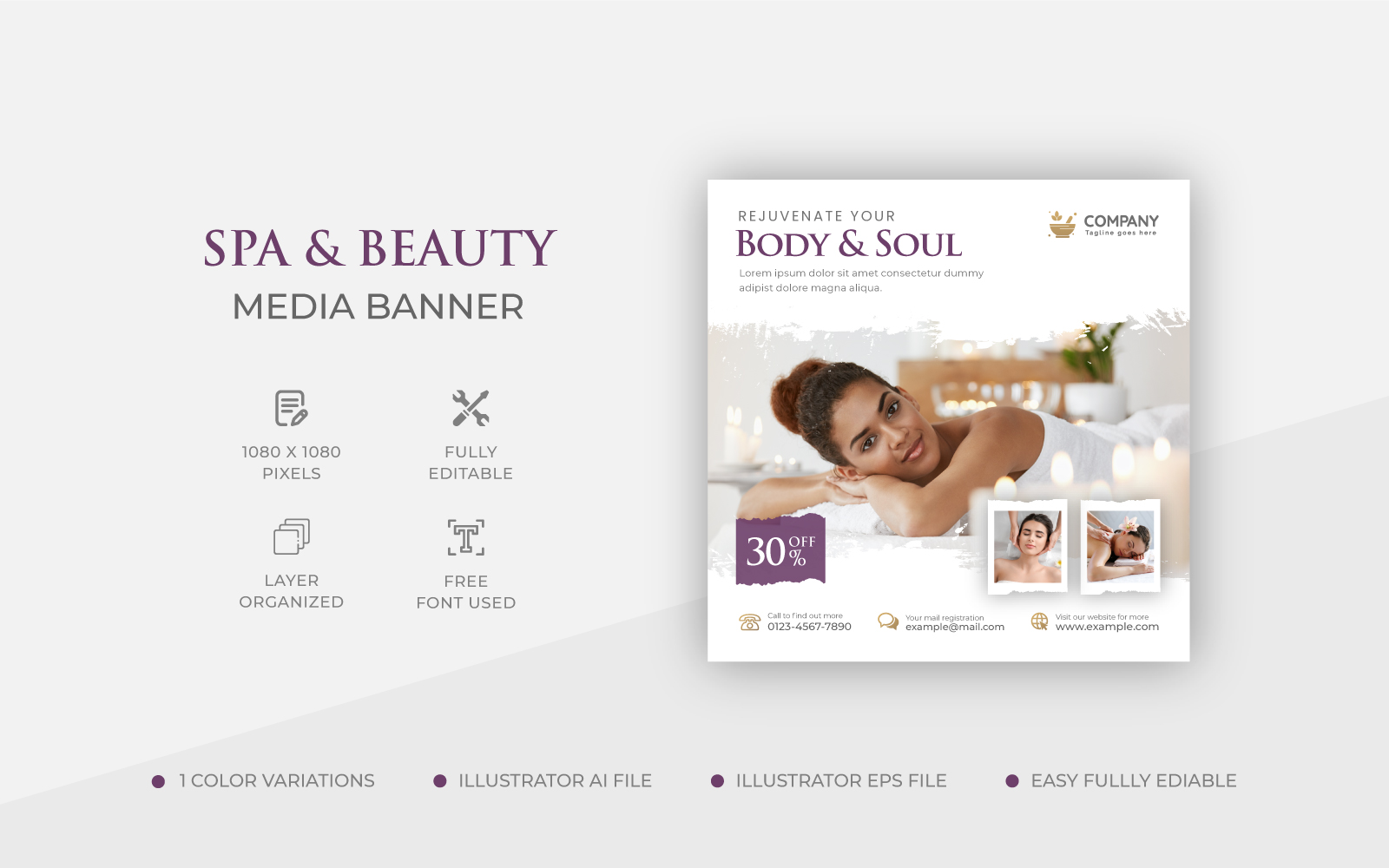 This is a clean eye-catchy Professional Spa & Beauty Promotion Social Media Post Template suitable for all businesses. Easy to edit, all you need to know is the very basics of Illustrator to change the text, Photos, Color, and everything.